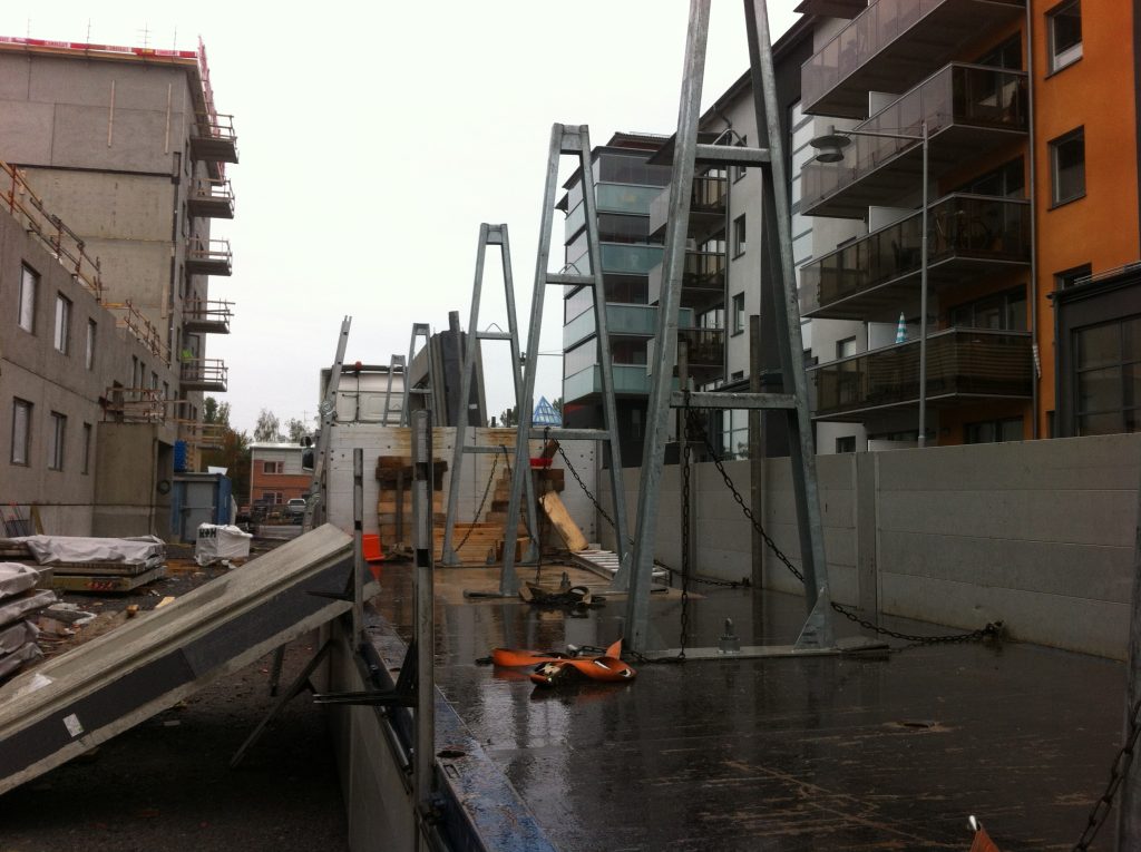 Påminnelse igen om att säkra lasten!Fotot visar att vägg som vält ur sin A-bock. Återigen så hade tillbudet undvikits om väggen varit säkrad.