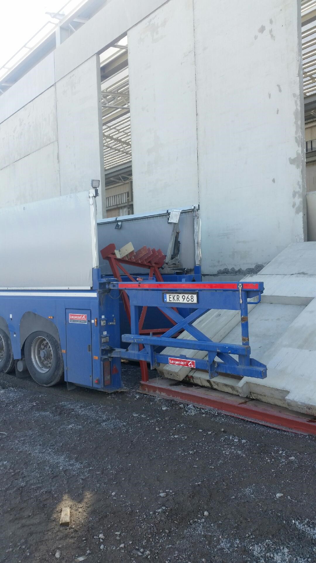 När bygeltrailern skulle ställa av flaket så hakade hydralarmen tag i grinden som håller väggarna. Väggarna rasar då mot byggnaden. Så som bilderna visar så har trailern börjat svänga vänster innan bygelflaket är helt fristående. DET ÄR AV STÖRSTA VIKT ATT KÖRA SPIKRAKT UT FRÅN BYGELFLAKET!
