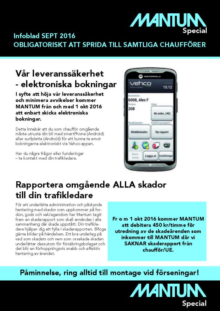 I syfte att höja vår leveranssäkerhet och minimera avvikelser kommer MANTUM från och med 1 okt 2016 att enbart skicka elektroniska bokningar. Detta innebär att du som chaufför omgående måste utrusta din bil med smartPhone (Android) eller surfplatta (Android) för att kunna ta emot bokningarna elektroniskt via Vehco-appen. Har du några frågor eller funderingar – […]