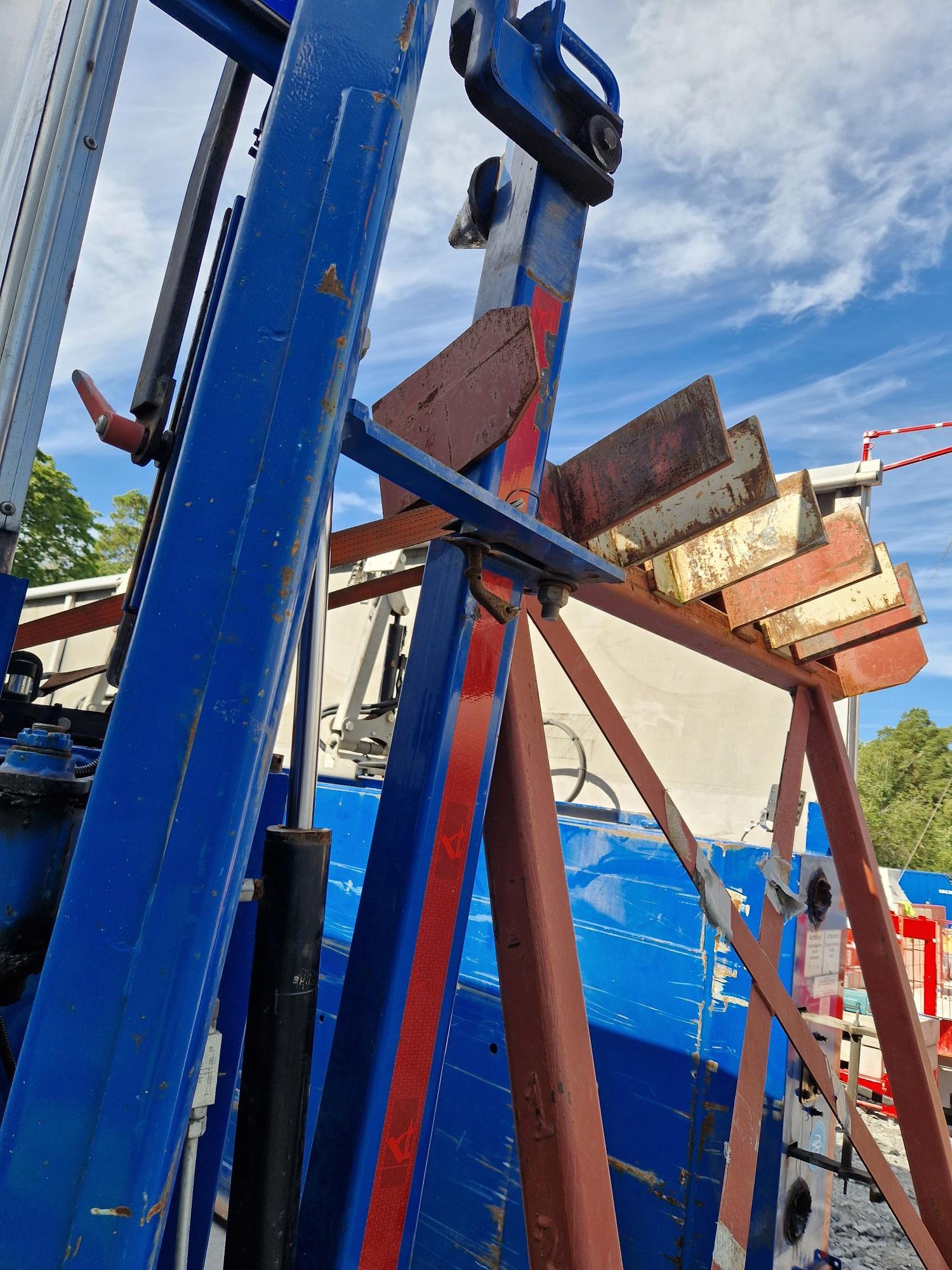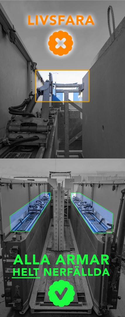 Detta är p.g.a. Att trots fritt utrymme mellan hydraularm och grinden (Se övre bild), så kan trailer och/eller flak vingla till vid avställning. Oftast vid sämre underlag, men även annars också. Så se ALLTID till att armarna är helt nedfällda vid avställning (Undre bild)
